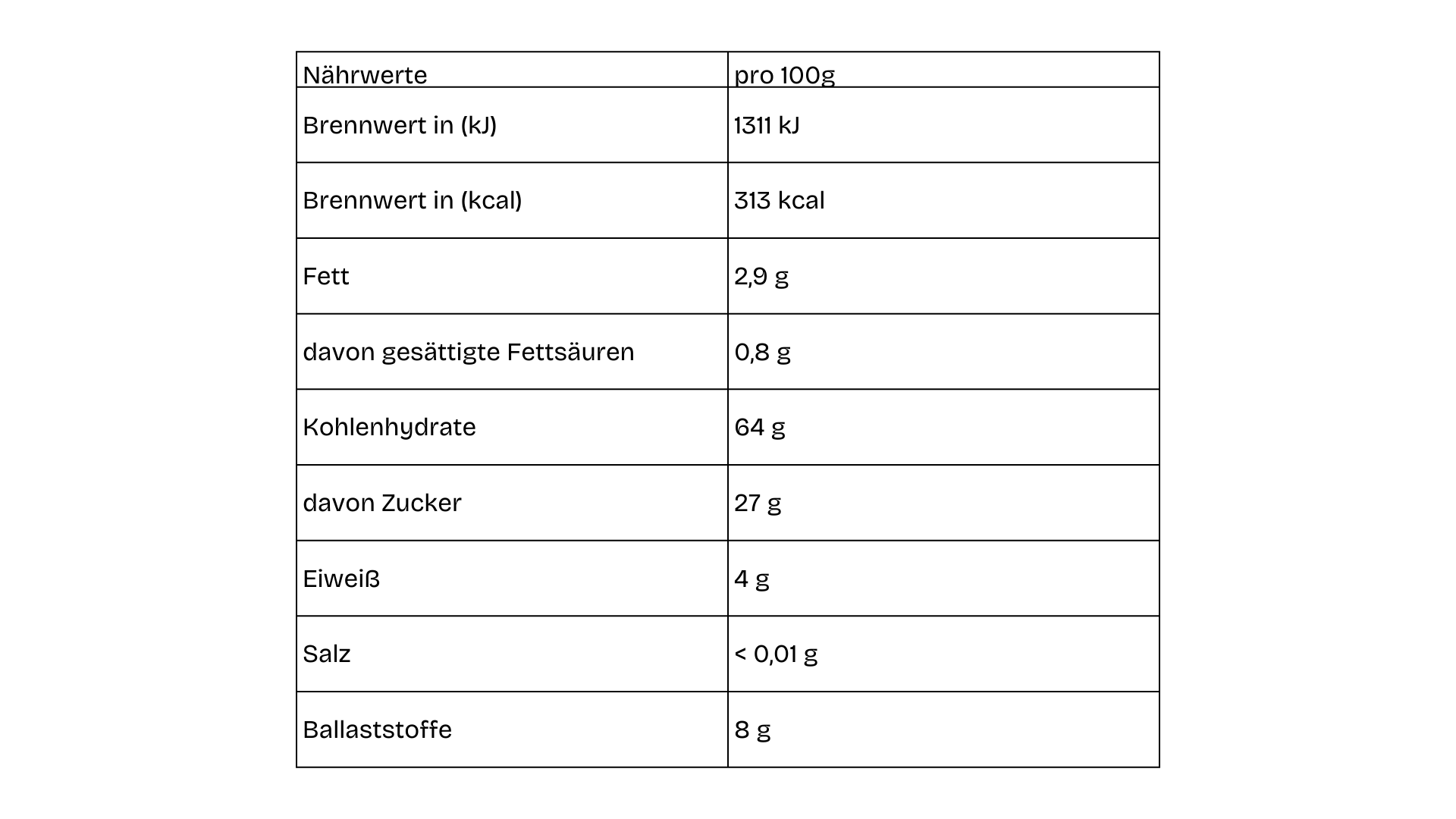 Nährwerte100 gBrennwert1.311 kJ313 kcalFett2,9 g– davon gesättigte Fettsäuren0,8 gKohlenhydrate64 g– davon Zucker (fruchteigener Zucker)27 gEiweiß4 gSalz<0,01 gBallaststoffe8 g