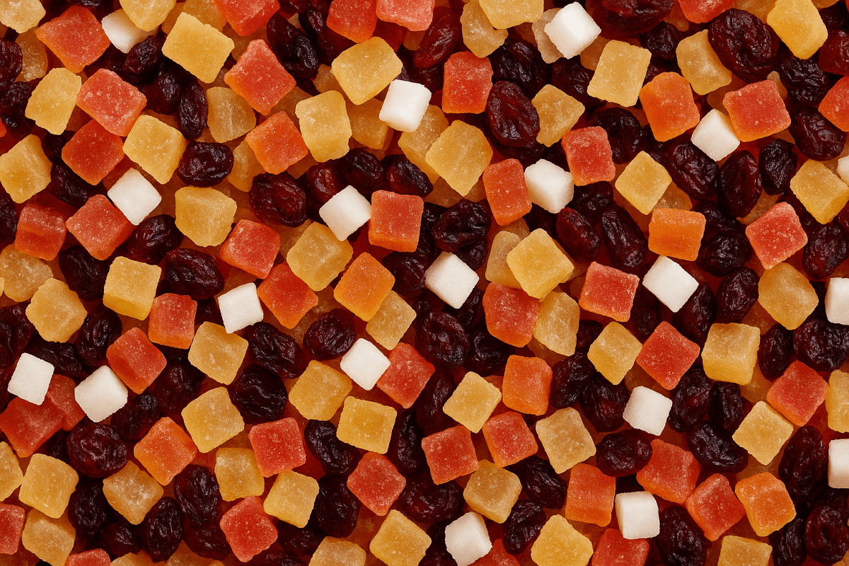 Früchte in veränderlichen Gewichtsanteilen. Ananas, Papaya, Honigmelone, Pomelo, Kokoswürfel, Cranberries und Rosinen. Alles gewürfelt & teilweise kandiert.