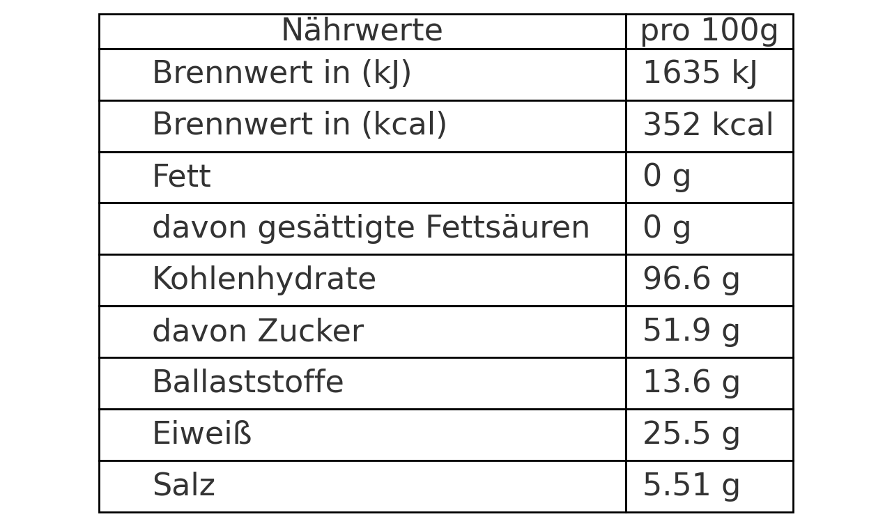 Bitte beachten Sie, dass unsere Produkte Spuren von Gluten, Soja, Nüssen, Mandeln, Erdnüssen, Milch (Laktose), Sesam und Schwefeldioxid (Sulfite) enthalten können.